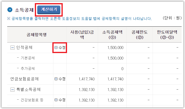 - 소득공제 및 세액공제 항목: 의료비, 교육비, 기부금, 신용카드 사용액 등